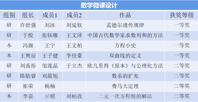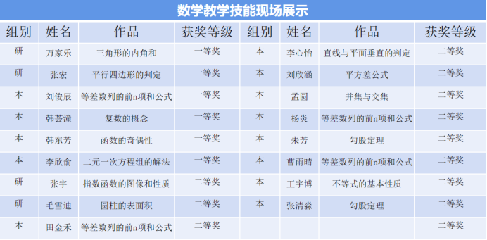 经过激烈的角逐,最终评选出数学微课设计一等奖4组、二等奖4组;数学教学技能现场展示一等奖6名、二等奖11名。