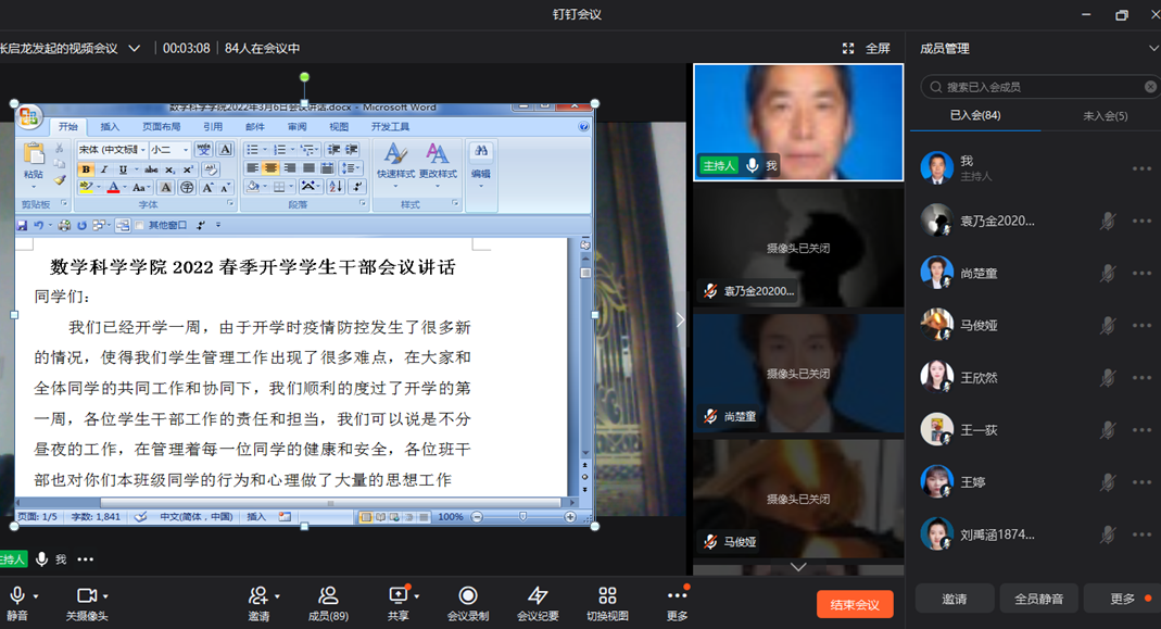 公司党委书记张启龙,通过召开钉钉会议形式对全体员工干部进行了培训,会上首先充分肯定了员工干部在开学第一周在疫情防控和员工管理发挥的作用,并表示深深的感谢。接着对常态下的疫情防控、校园安全与文明守纪、课业学习与线上授课管理、寝室卫生与线上授课环境、同学们个人饮食健康、身心健康与体育锻炼、形势教育与注意舆论舆情等6个方面进行了“开学第一课”教育。培训后以班级为单位,通过班团活的方式深入教育到每名同学。