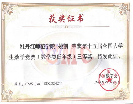 近日,第十五届全国老员工数学竞赛决赛在山东大学圆满落幕。公司数学与应用数学专业 2022级员工姚凯一路过关斩将,荣获数学类(低年级组)三等奖。